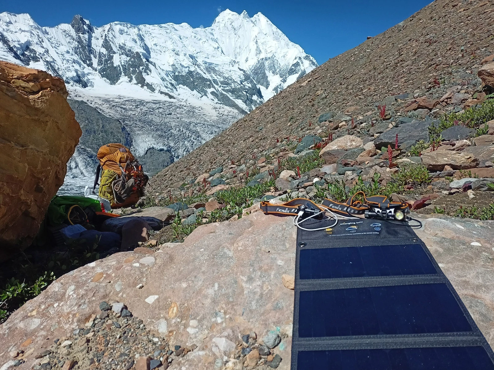 Pôvodná verzia panelu Crossio SolarPower 28W 3.0 celé 2 mesiace zásobovala energiou naše satelitné telefóny, mobily a čelovky v Pakistane. Ľahký, kompaktný a výkonný solár sme mali cez deň zavesený na batohu a napojený na powerbanky. Vo výškových táboroch bol upevnený na stane alebo opäť na batohu. Jeho výkon bohato stačil pre 3 ľudí. A to sme ho používali zhruba štvrtinu úžitkového času. Pravdou je, že v týchto končinách nebola úplne možnosť plytvať energiou na scrollovanie instagramom, ale na fotenie, navigáciu, audioknihy, volanie sateliťákom a napájanie čeloviek a pod. nám to stačilo. Pri priamom slnečnom svite sme nabíjali rýchlo aj viac čeloviek či telefónov naraz. Keď bolo treba, nabíjali sme aj pri oblačnosti či hmle. Výkon bol samozrejme nižší, ale aj tak sa vyplatilo ukladať slnečnú energiu do batérií. Každý sme mali jednu powerbanku (10 000 mAh) a navrch ešte jednu spoločnú len na sateliťák a ako rezervu (40 000 mAh).