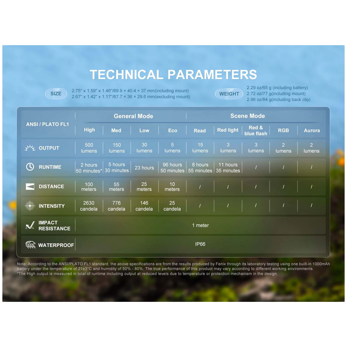 Všetky parametre svetlometov (svetelný tok, výdrž batérie, vodotesnosť, dosah a odolnosť proti nárazom) sa merajú v súlade s normou ANSI/NEMA FL 1-2009.