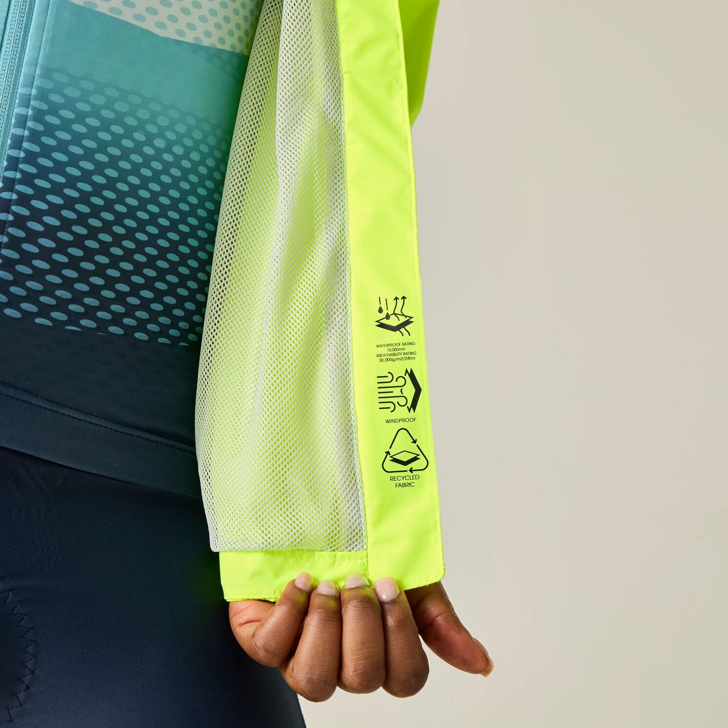 Materiál ARED 10/30K z recyklovaného polyesteru poskytuje spoľahlivú ochranu pred dažďom vďaka vodnému stĺpcu 10 000 mm a zároveň ponúka vysokú priedušnosť až 30 000 g/m²/24 h. Podlepené švy a vodoodolný zips zabraňujú prenikaniu vody, zatiaľ čo vetracie panely na bokoch pomáhajú regulovať teplotu pri náročnej jazde.