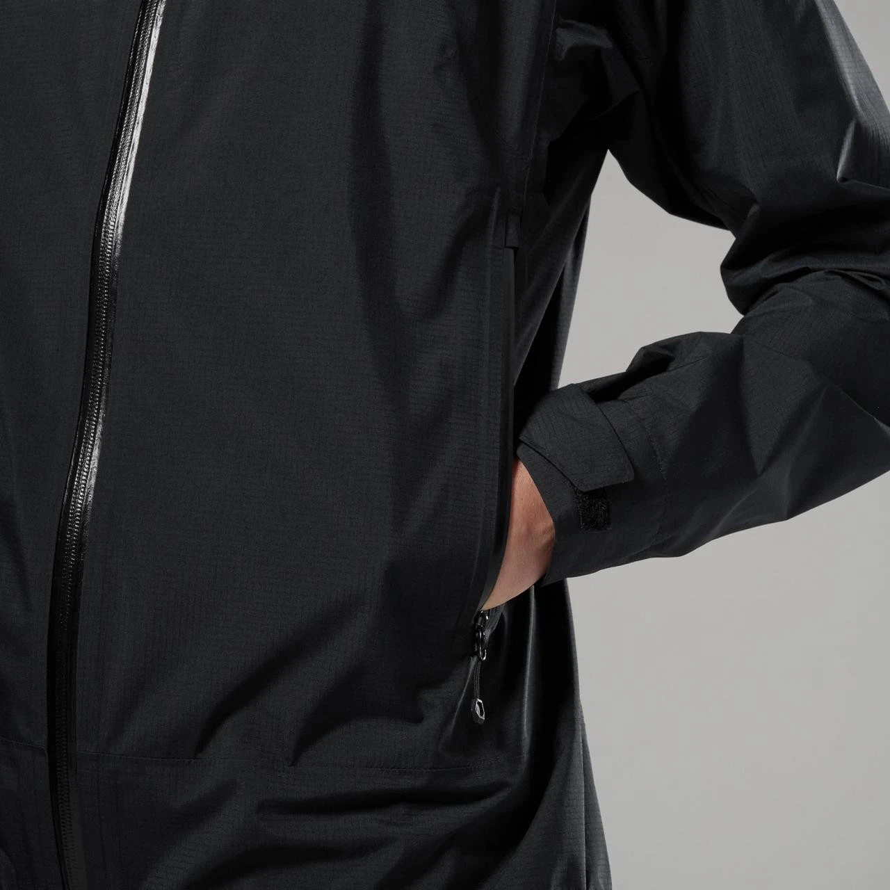 Základ tvorí materiál Pertex® Shield 2,5 L, ktorý kombinuje recyklovanú 40D ripstop tkaninu s vodeodolnou a vetruodolnou membránou. Vnútorná 20D trikotová podšívka je príjemná na dotyk a zvyšuje komfort pri nosení. Konštrukcia je navrhnutá s dôrazom na nízku hmotnosť a funkčnosť, pričom obmedzený počet švov pomáha zvýšiť odolnosť a zároveň podporuje priedušnosť pri aktívnom pohybe.