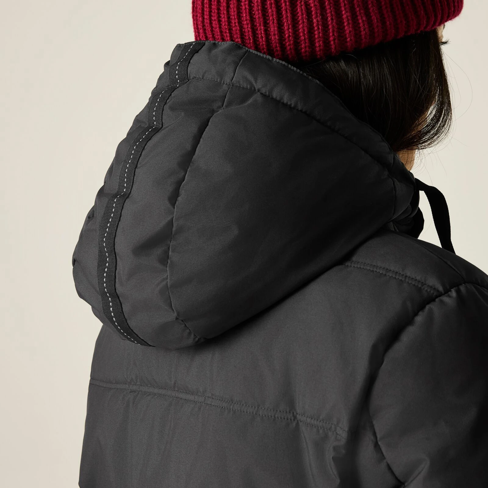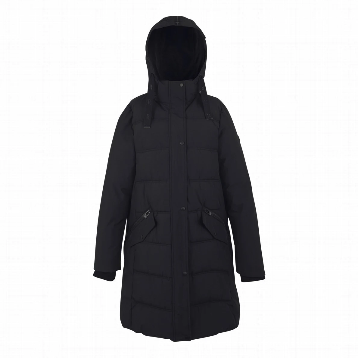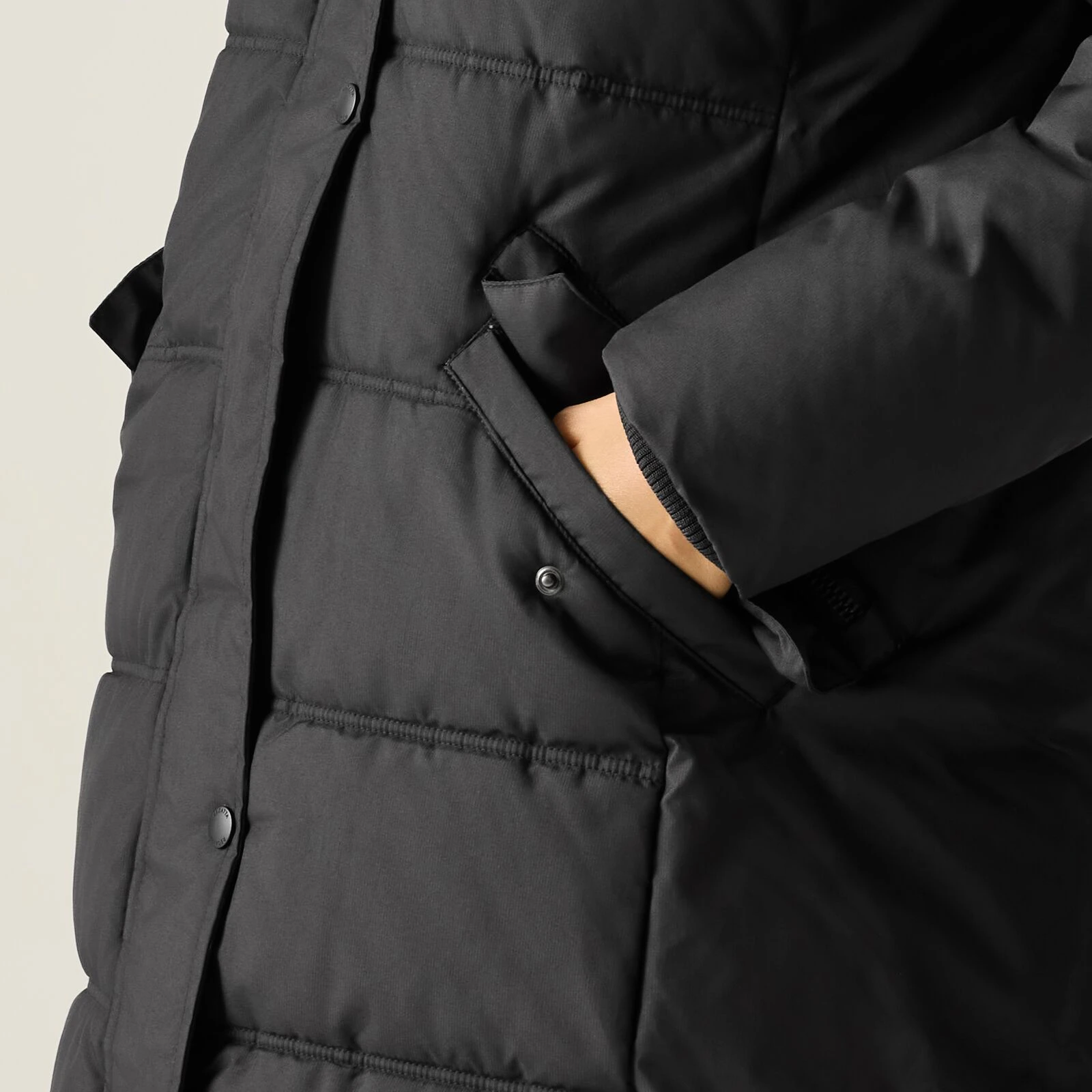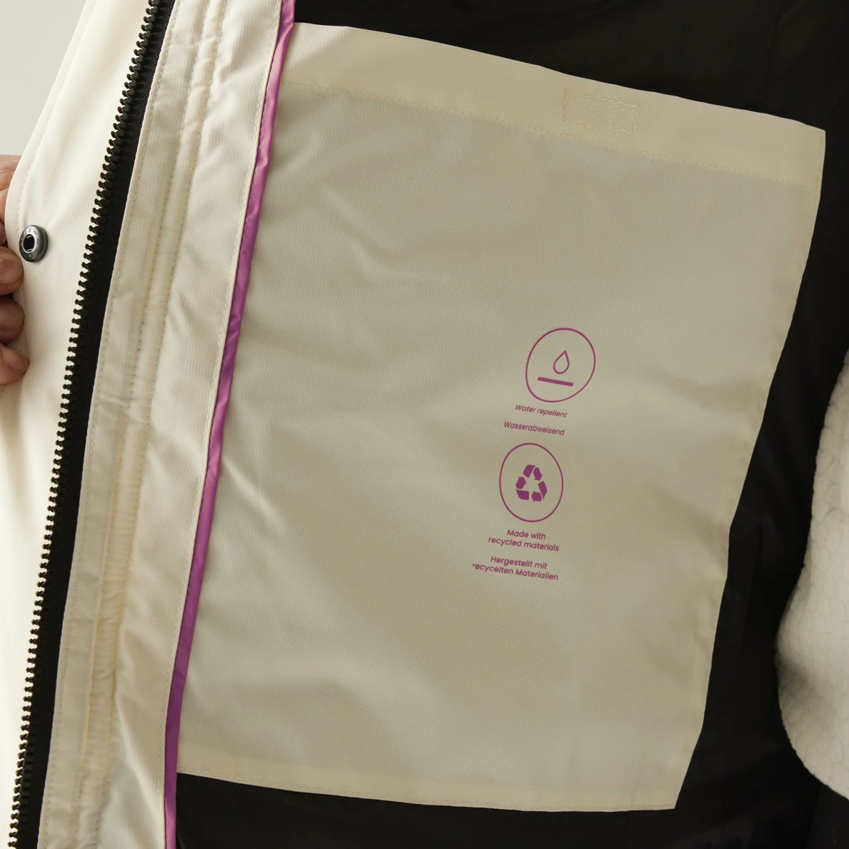 Funkčné detaily, ako je dvojcestný centrálny zips, rebrovaný golier a manžety, alebo dekoratívna sťahovacia šnúrka, podčiarkujú kvalitu aj praktickosť kabátu. Nechýbajú ani dve veľké spodné vrecká s dvojitým vstupom – na ruky aj na zips, a dve vnútorné bezpečnostné vrecká na drobnosti. Celý model je vyrobený s využitím recyklovaných materiálov, čo podporuje udržateľnejší prístup k móde.