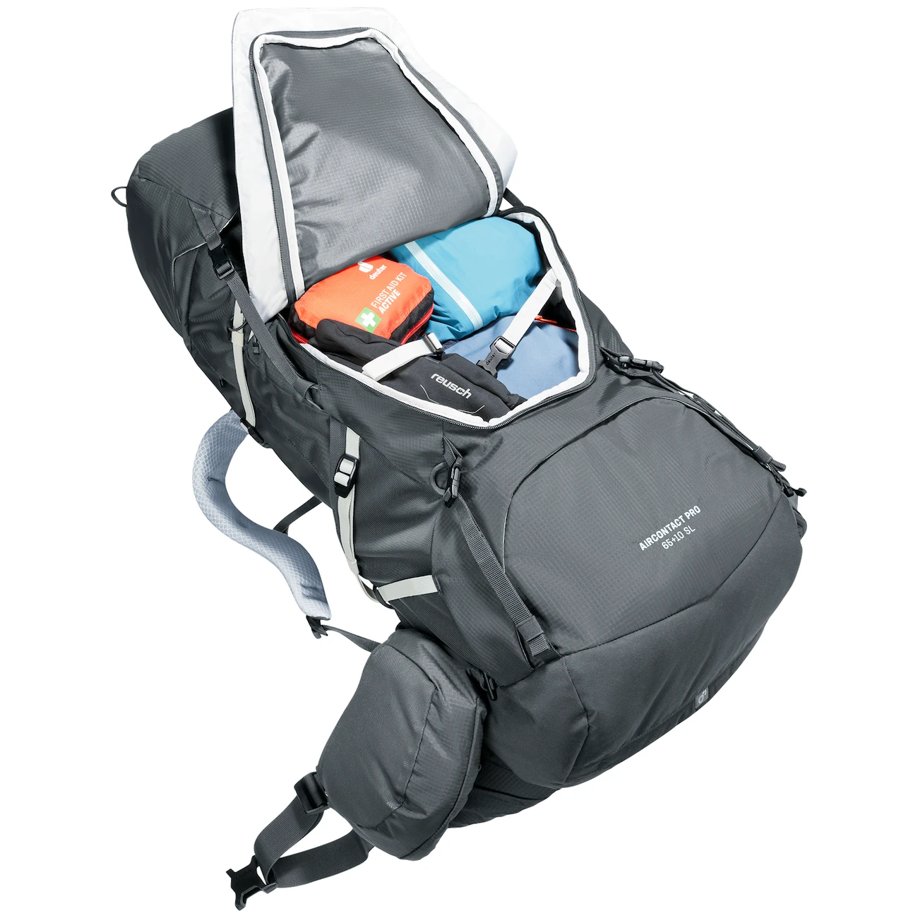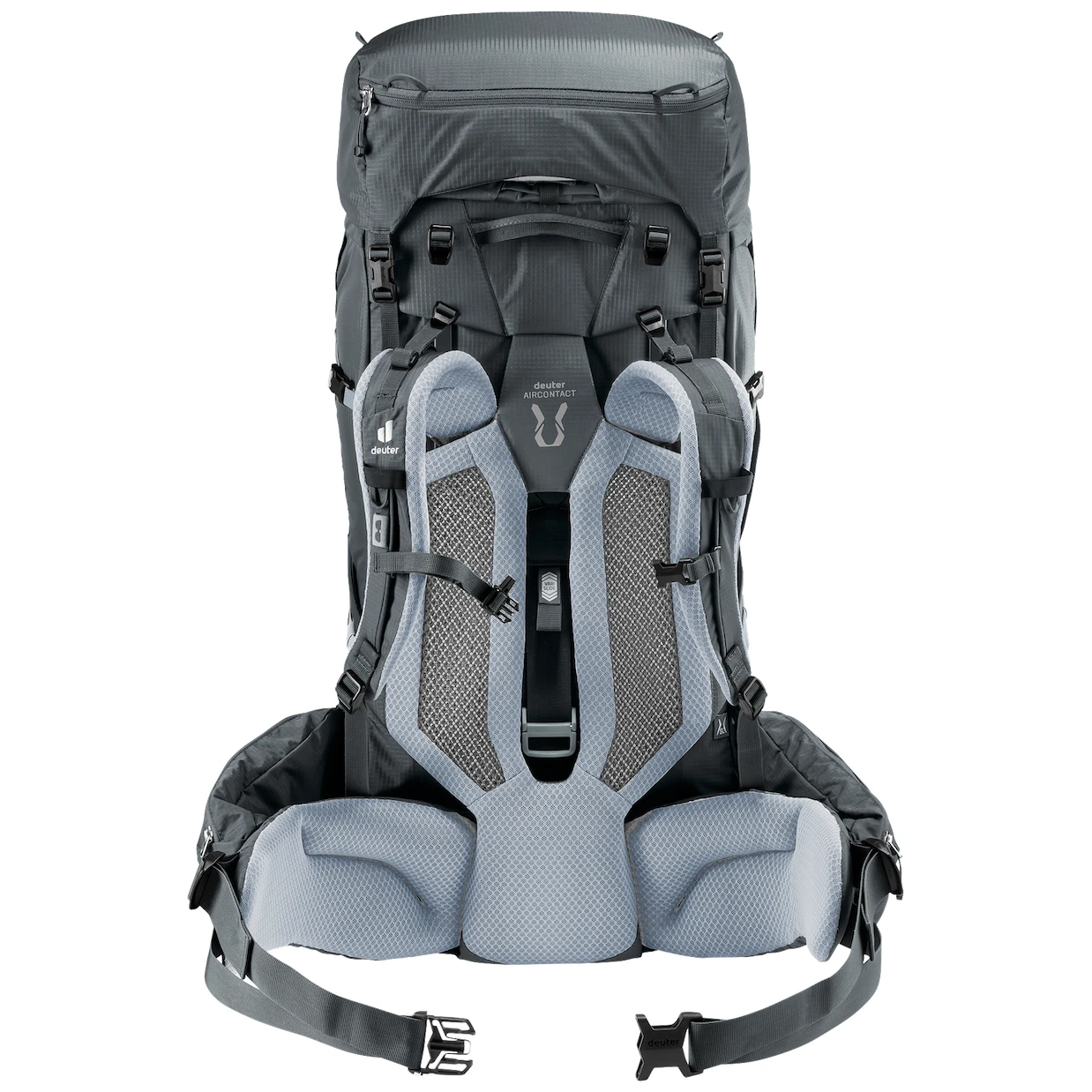 Batoh je vyrobený z pevného materiálu, ktorý je odolný proti roztrhnutiu. Je mimoriadne ľahký a 70 % hmotnosti spočíva na bohato polstrovanom, ergonomicky tvarovanom bedrovom páse, ktorý umožňuje lepšie rozloženie hmotnosti. Chrbtový systém Aircontact Pro s funkčnou penou a ventilačnou sieťovinou zabezpečuje pohodlnú výmenu vzduchu pri každom pohybe. Hliníkové vzpery rámu pomáhajú držať tvar. Vďaka technológii VariSlide si môžete nastaviť dĺžku operadla podľa svojej výšky. Ramenné popruhy ActiveFit sú tiež ergonomicky tvarované a majú dvojcestne nastaviteľný hrudný popruh s bezpečnostnou píšťalkou. Výsledkom je batoh, ktorý je pohodlný aj po dlhých kilometroch a ťažkých nákladoch.