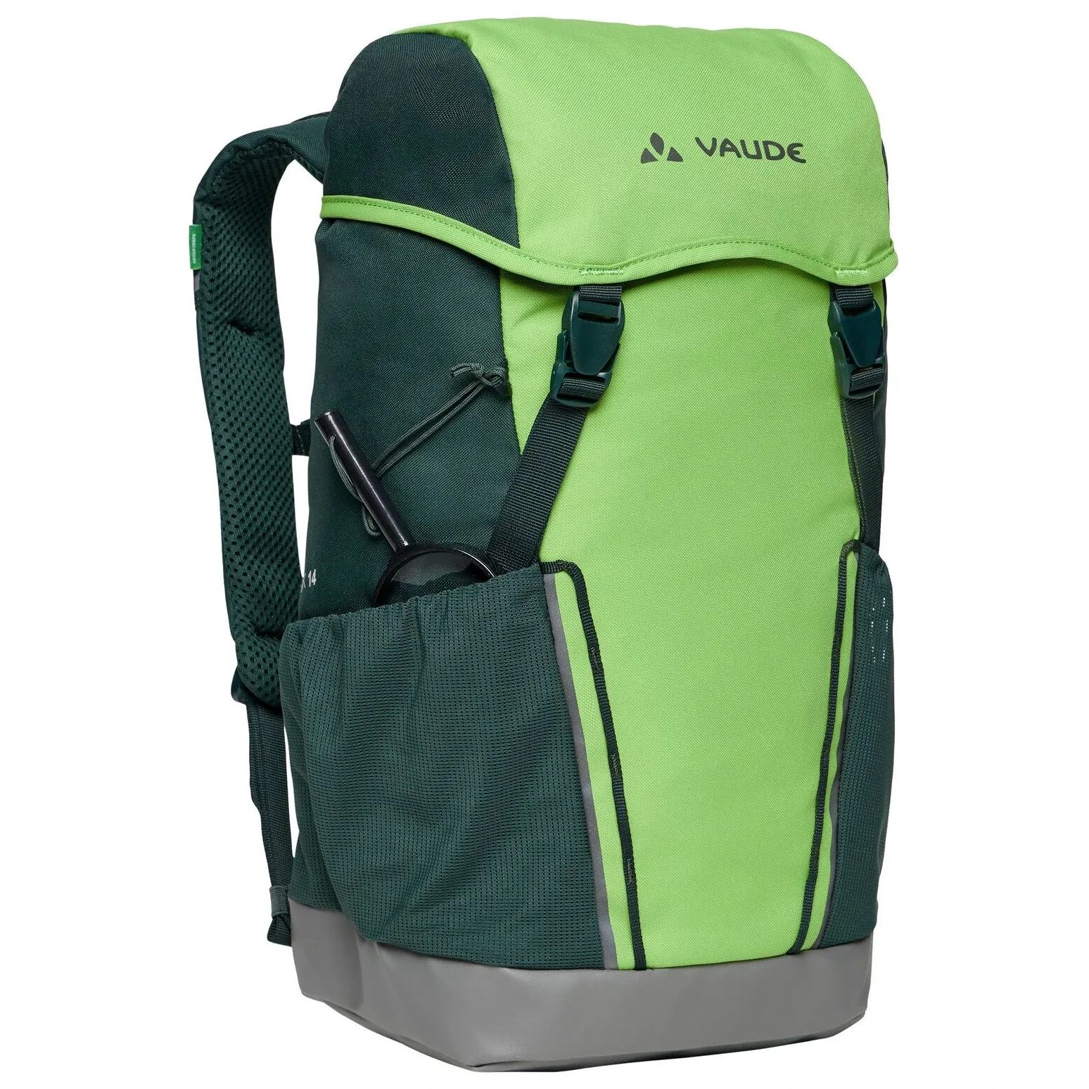 Pohodlný detský plecniak Puck 14, značky Vaude, je v tejto verzii ešte lepšie prispôsobený potrebám detí. Má vodeodolnú podlahu, takže sa nemusíte obávať, keď deti batoh postavia do mokra. Systém odpruženia a nastaviteľný hrudný popruh zaisťujú to najpohodlnejšie nosenie. Súčasťou plecniaka je aj pláštenka a polstrovaná podložka na sedenie. Batoh má dve priestranné sieťované vonkajšie vrecká, reflexnú potlač a vrecko vo veku na drobnosti. Malých objaviteľov poteší, že batoh Puck 14 má zabudovanú lupu. Tento batoh je vyrobený z recyklovaného materiálu s Eco Finish - ekologickým vodeodpudivým materiálom bez použitia fluorokarbónov (PFC).