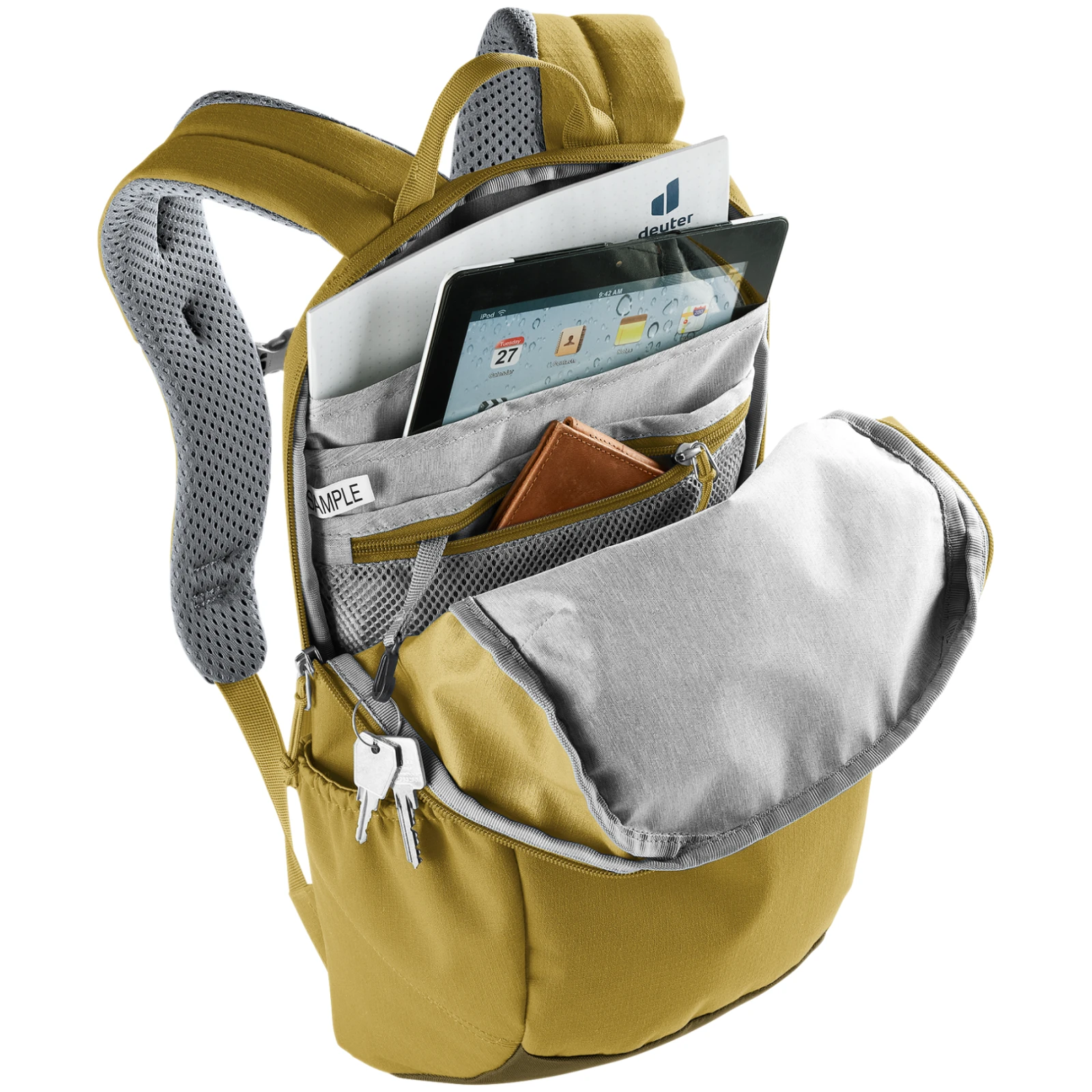 V hlavnej priehradke na zips v okrúhlom oblúku sa nachádza priehradka na dokumenty, priehradka na notebook a vrecko na zips s klipom na kľúče. Na bokoch sú dve elastické vrecká na fľašu s nápojom. Na zadnej strane je vrecko na mobilný telefón, ktoré umožňuje jednoduchý prístup bez nutnosti batoh odopínať. Bočný zips je navrhnutý na priamy prístup do priestoru na notebook.