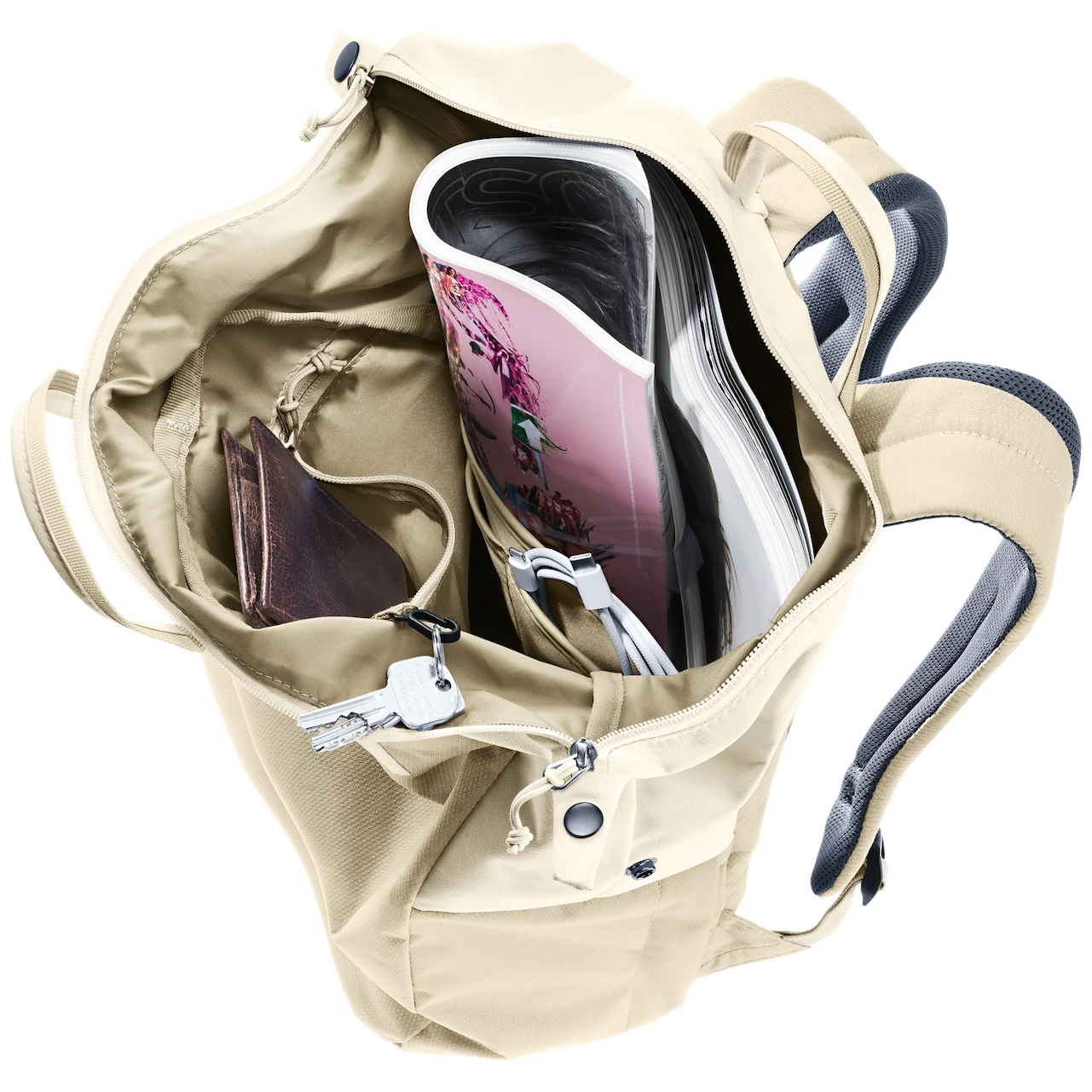 Hlavná priehradka má zips na hornej strane a obsahuje priehradku na dokumenty, vnútorný organizér a vrecko na zips s klipom na kľúče. Na vonkajšej strane je bočné vrecko na mobilný telefón.