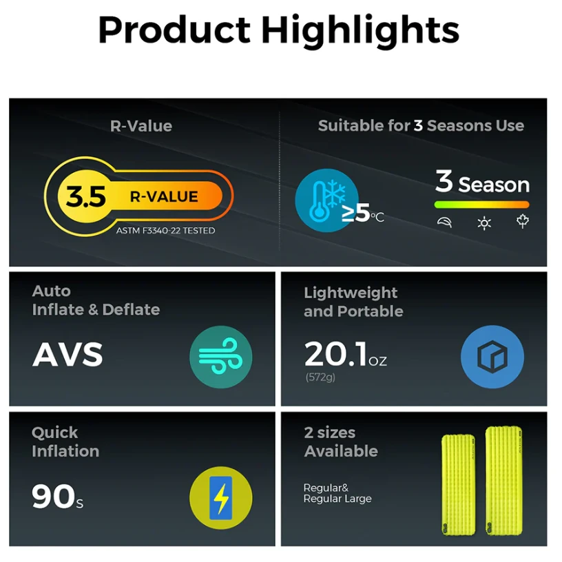 TINY Sleeping Pad R03 AVS od značky Flextail je moderná trojsezónna karimatka, ktorá kombinuje ultraľahkú konštrukciu, výbornú izoláciu a vstavanú batériovú pumpu pre maximálny komfort na cestách. Váži len 572 g a v zbalenom stave meria 11 × 28 cm – ľahko sa zmestí do batohu, ale ponúkne plnohodnotný spánok aj v náročných podmienkach. Vďaka integrovanej vzduchovej pumpe nafúknete karimatku počas 90 sekúnd – a bez jediného fúknutia ústami