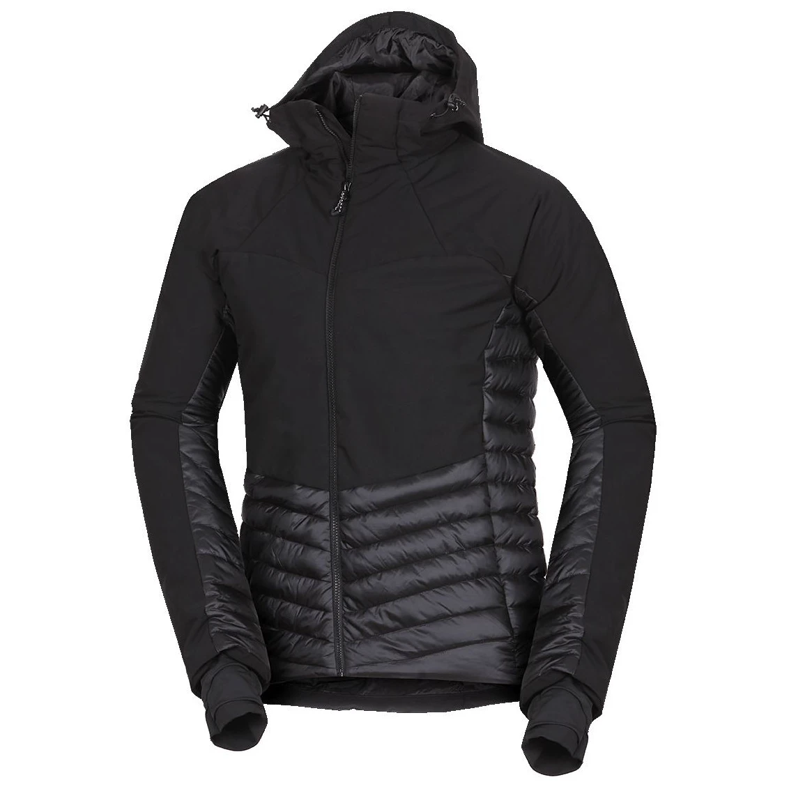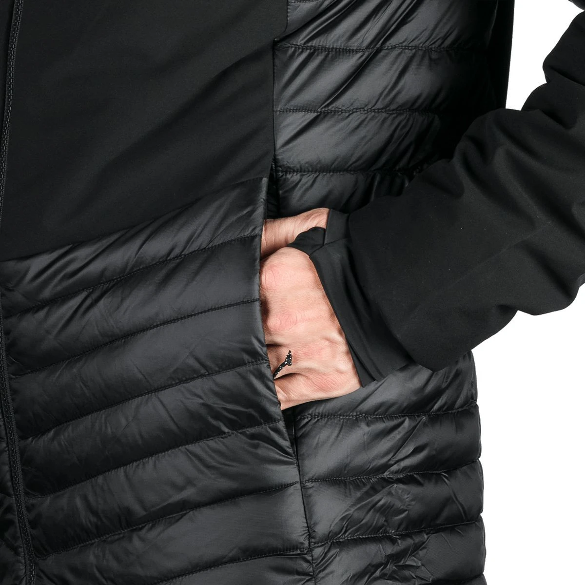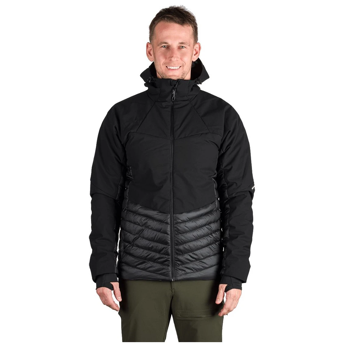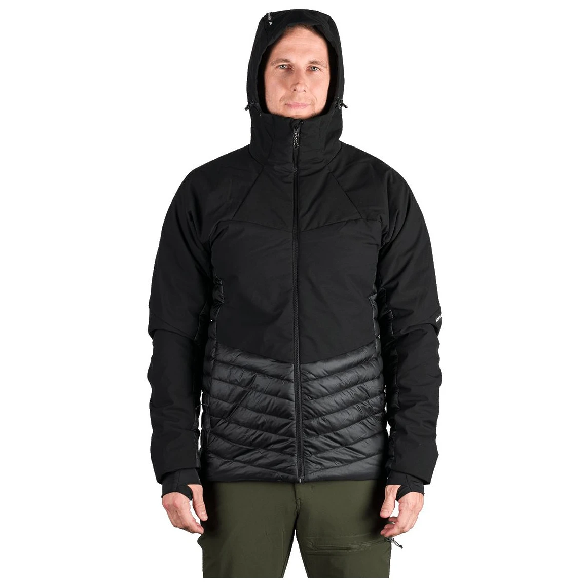 Vrchná časť z ľahkého trojvrstvového softshellu s membránou 20 000 mm H₂O / 20 000 g/m²/24 h chráni pred silným vetrom a dažďom, zatiaľ čo hrudné a zadné panely s 2,5-vrstvovou membránou 10 000 mm H₂O / 10 000 g/m²/24 h zaisťujú ľahkosť a priedušnosť. Spodná časť, boky a vnútorné strany rukávov zateplené prešívanou tkaninou s WR úpravou bez PFC zvyšujú komfort pri pohybe.