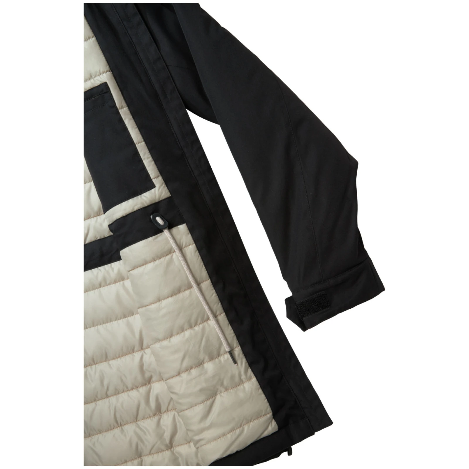 Klasický strih kabáta so šnúrkou v páse vám umožní prispôsobiť si ho svojmu štýlu, zatiaľ čo rukávy sa dajú ľahko upraviť pomocou suchého zipsu. Pevná nastaviteľná kapucňaa dvojcestný kostený zips s kovovým efektom dodávajú kabátu moderný vzhľad a zvyšujú jeho funkčnosť.