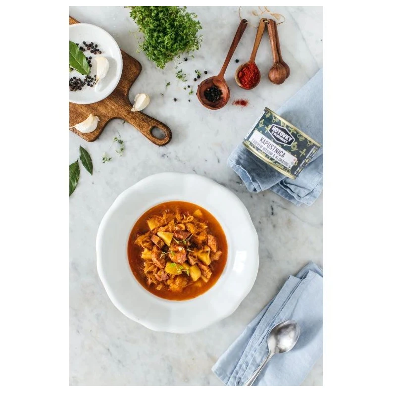 Výdatná polievka kombinuje bohatú chuť kyslej kapusty s kvalitným údeným bravčovým mäsom a klobásou, čo z nej robí ideálny pokrm pre milovníkov tradičnej českej kuchyne. Vďaka praktickému baleniu v plechovke je vhodná na rýchle domáce stravovanie aj ako zásoba na cesty alebo do prírody. Stačí ju len ohriať a môžete si vychutnať plnohodnotné jedlo bez zložitej prípravy.