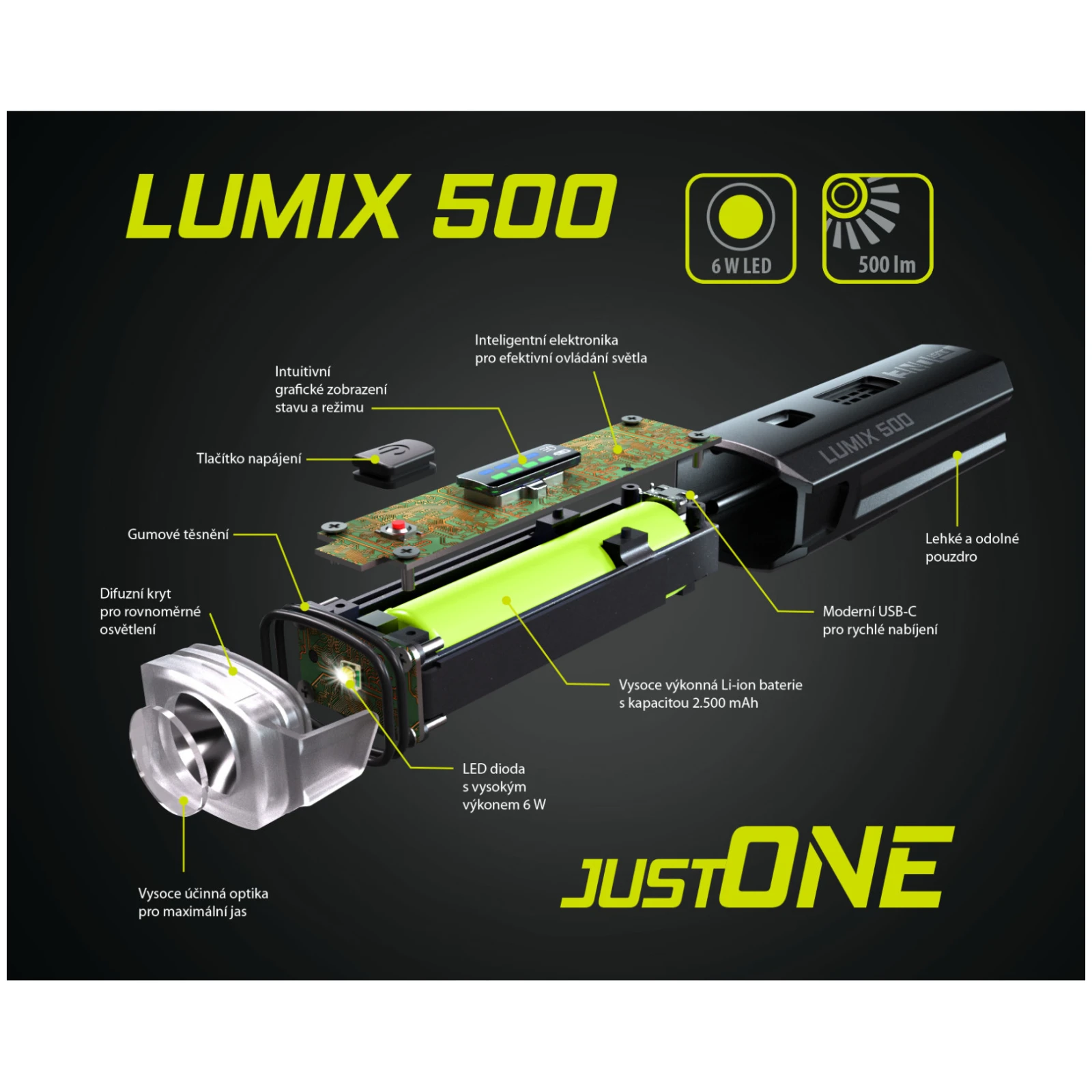 Predné svetlo Just One LUMIX 500 ponúka 3 intenzity svietenia a blikania, grafické zobrazenie funkcií, vodoodolnú konštrukciu IPX4 a dobu svietenia až 13 hodín.