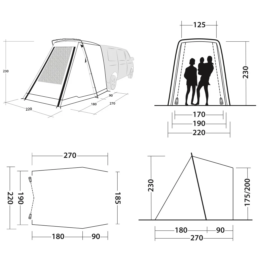 Do stanu vedie veľký bezbariérový vchod, ktorý možno použiť aj ako prístrešok (tyče nie sú súčasťou balenia). Veľké sieťované okno s vodotesnou clonou prepúšťa dostatok svetla, ale zároveň aj ochranu pred UV žiarením a súkromie. Zadné dvere vozidla možno otvoriť dovnútra, systém upevnenia zároveň neblokuje bočné dvere.