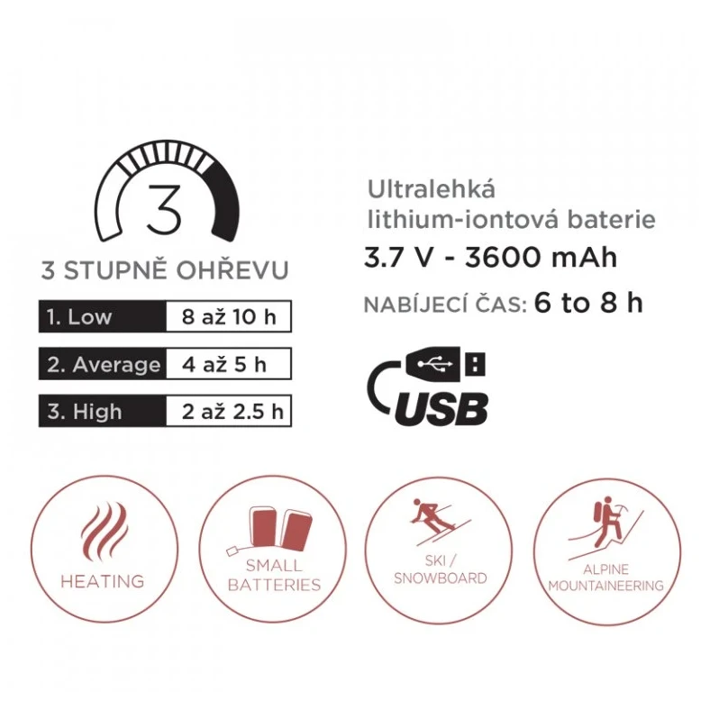 Rukavice majú praktické detaily - rebrované manžety, sťahovaciu šnúrku, bezpečnostné pútko proti strate, ktoré sa ľahko zmestí pod rukáv bundy. Nabíjanie prebieha cez USB kábel (adaptér 230 V nie je súčasťou balenia).