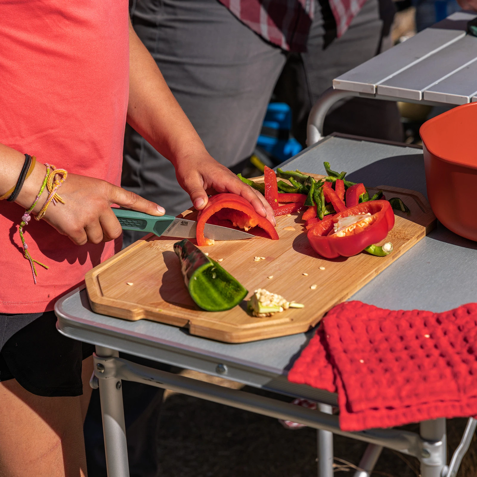 Súprava dosiek na krájanie Gerber Compleat obsahuje dve obojstranné dosky na krájanie z bambusu a polypropylénu, nôž na krájanie s priemerom 8,25 cm, kuchársky nôž s priemerom 15 cm a odkladaciu podložku. Keď príde čas na zbalenie tábora, všetko je kompaktne zbalené.