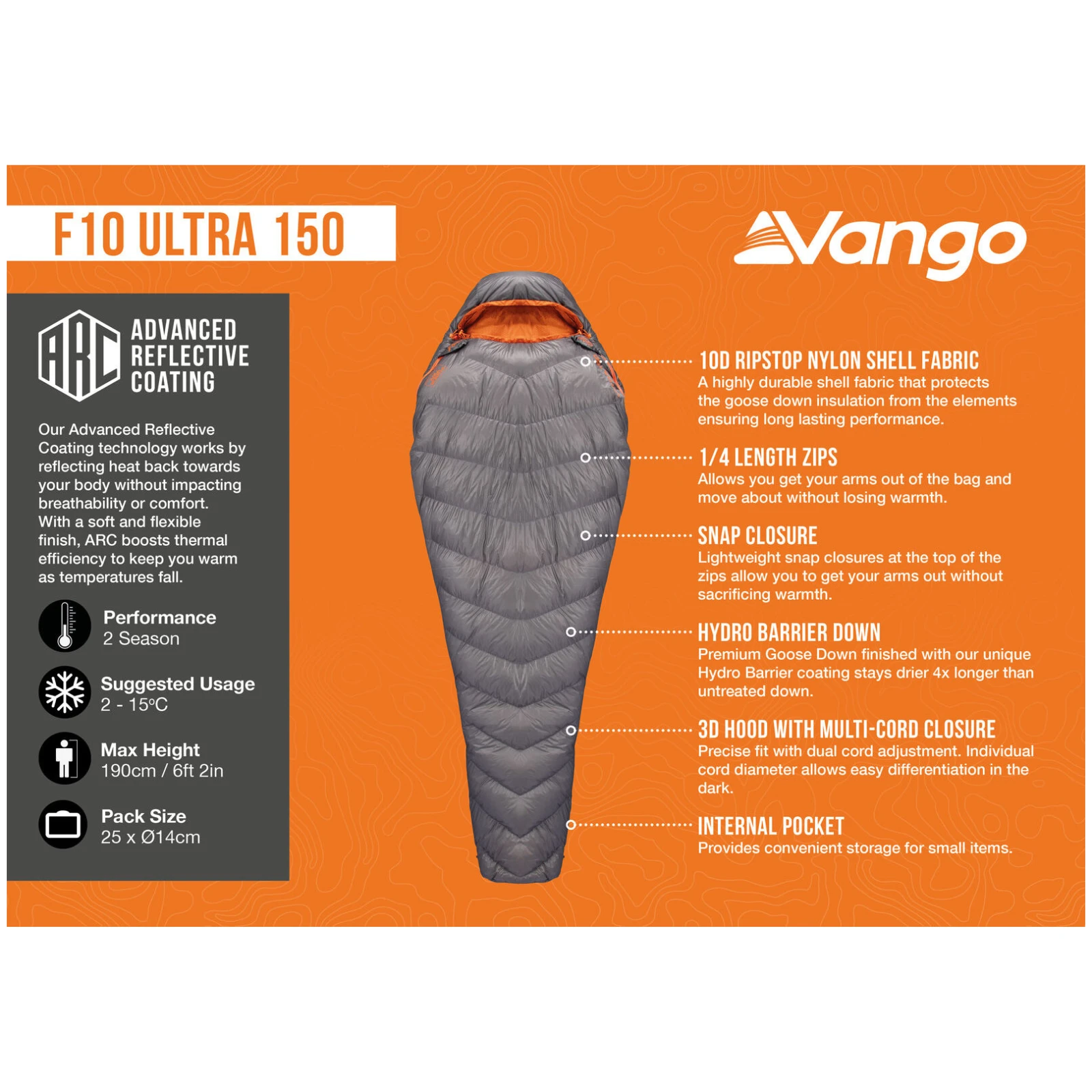 Vonkajšia tkanina z 10D ripstop nylonu je ľahká, ale zároveň veľmi odolná. Vo vnútri spacieho vaku sa nachádza 150 g prémiového husacieho peria s plnivosťou 1000 cuin, ktoré je ošetrené technológiou Hydro Barrier Down – perie si tak zachováva svoje izolačné vlastnosti až 4× dlhšie aj pri navlhnutí. Strategicky umiestnená technológia ARC (Advanced Reflective Coating) odráža telesné teplo späť k vám, bez toho, aby znižovala priedušnosť alebo komfort.