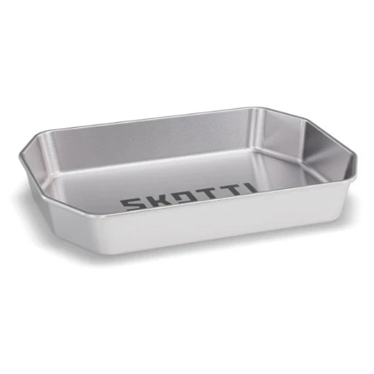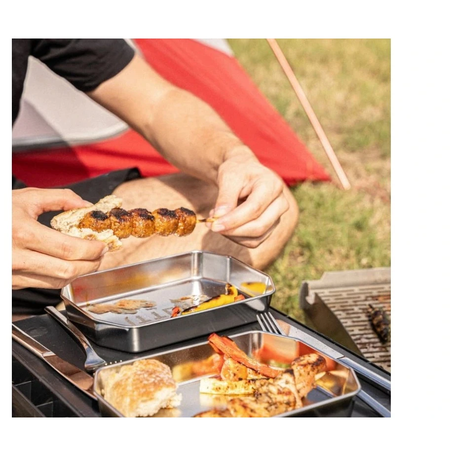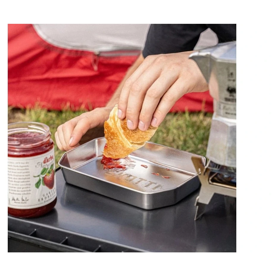 Kempingový tanier SKOTTI Plade z odolnej nehrdzavejúcej ocele ponúka praktický hranatý tvar pre úsporné skladovanie a jednoduché použitie pri cestovaní aj vonkajšom varení.
