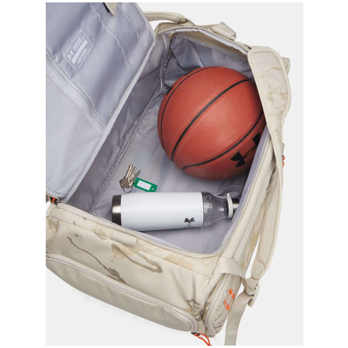 Usporiadanie tašky sa rozdeľuje na veľké priedušné vrecko na oblečenie alebo topánky a ďalšie vnútorné vrecká pre jednoduchšiu organizáciu. Komfortné uši na nosenie a dlhý nastaviteľný popruh cez rameno uľahčia manipuláciu a cestovanie. Tašku je možné pretransformovať aj na batoh, ktorý sa ľahko nosí na dvoch ramenných popruhoch.