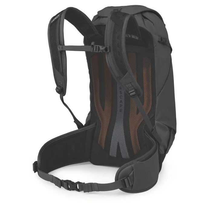 Chrbtový panel AirScape™ s penovou výstužou Atilon zaisťuje stabilné usadenie batoha blízko chrbta a efektívnu ventiláciu. Polstrovaný bedrový pás so strečovými vreckami a nastaviteľný hrudný popruh s píšťalkou prispievajú k pohodliu aj pri dlhšom nosení. Horné a spodné kompresné popruhy stabilizujú náklad a umožňujú uchytenie trekingových palíc.