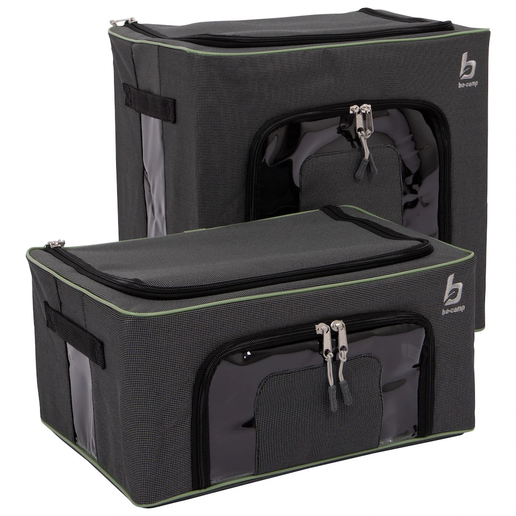 Táto súprava pevných úložných boxov ponúka dva rôzne rozmery a je vybavená oceľovým rámom pre maximálnu stabilitu. Odolný 600D polyester chráni uložené veci pred vlhkosťou, nečistotami aj hmyzom. Vďaka dvom priehľadným oknám na prednej strane ľahko zistíte obsah boxov bez toho, aby ste ich museli otvárať. Predný zips zaisťuje jednoduchý prístup dovnútra. Boxy možno navyše rýchlo a úsporne zložiť.